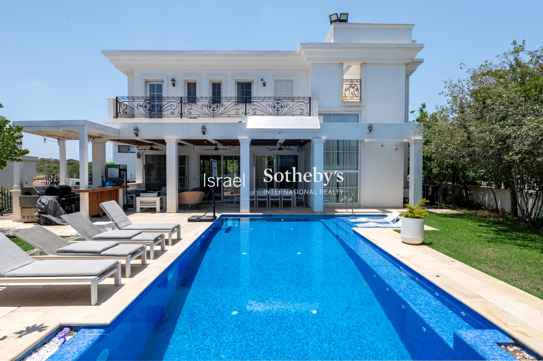 Situated in one of the newest clusters in one-and-only Caesarea this exquisite 550 m2 classic style villa combines meticulously planned floor plan and high-quality natural materials and boasts a spacious living room, a formal dining room, a designer kitchen, an office, two en-suite bedrooms and a grand master bedroom plus three additional bedrooms in a fully finished basement. The grand lawn allows optimal indoor-outdoor living, ideal for entertaining.