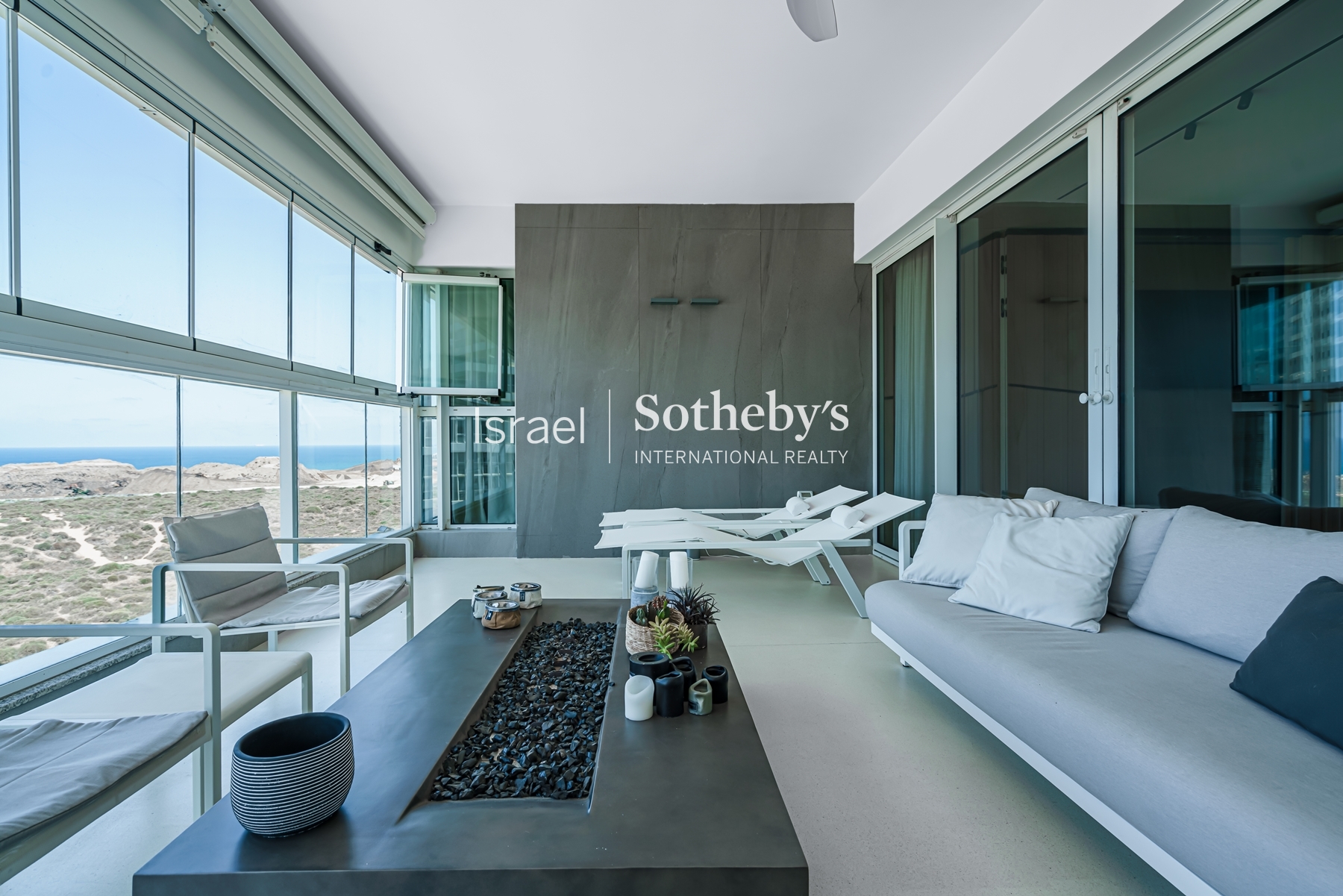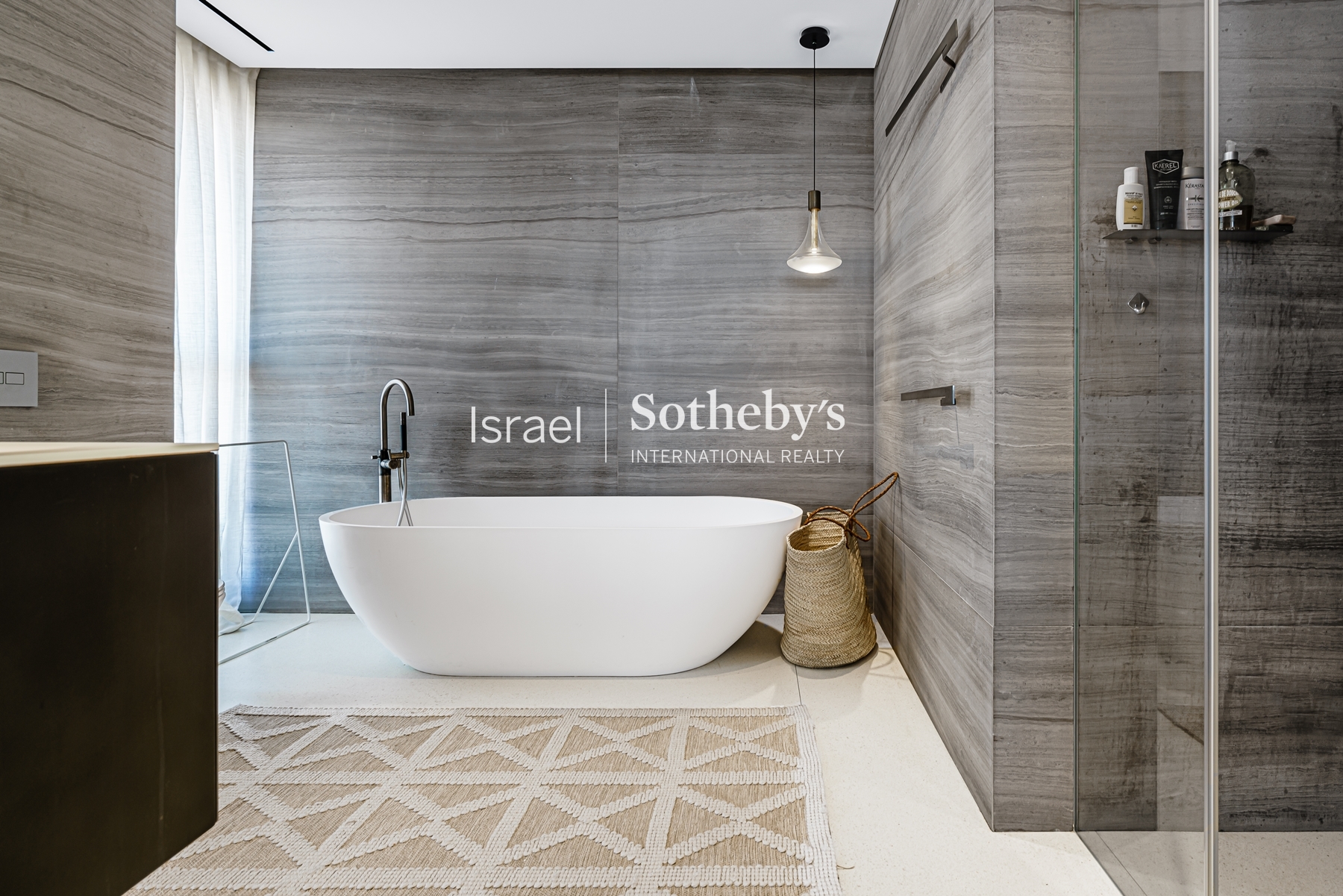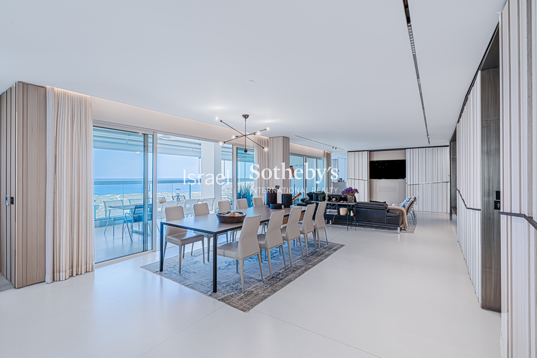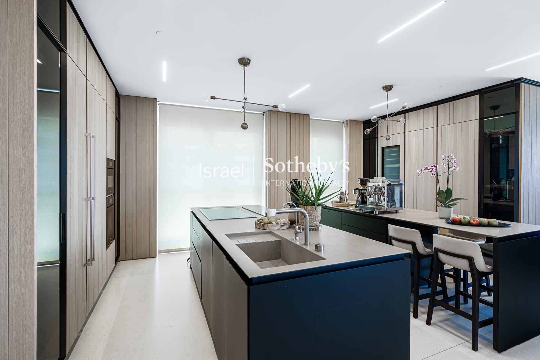 This apartment spreads over 295 m2 on one level with additional 48 m2 of covered terraces featuring an outdoor kitchen, fireplace, sun beds and breathtaking sunsets over the Mediterranean Sea. The meticulously designed by Tal Goldsmith Fish plan includes an open space living room with a fireplace, three guest and one vast in-suite master bedroom, two family corners and an office. The designer kitchen by Habitat is fully equipped with Miele electric appliances. In addition, it features an island along with a built-in wine fridge.