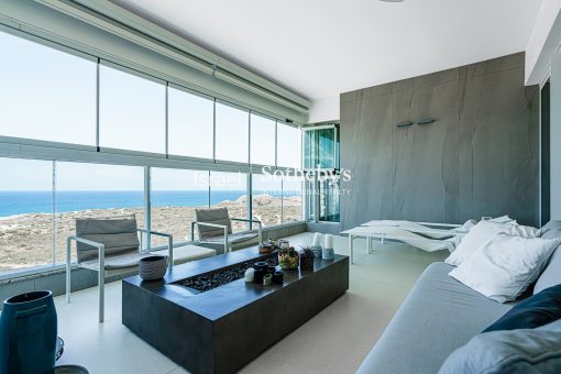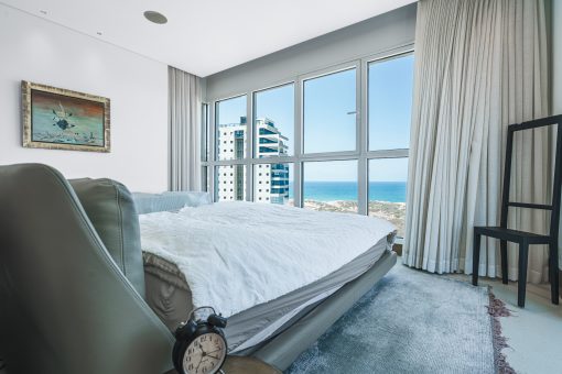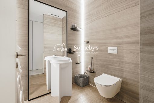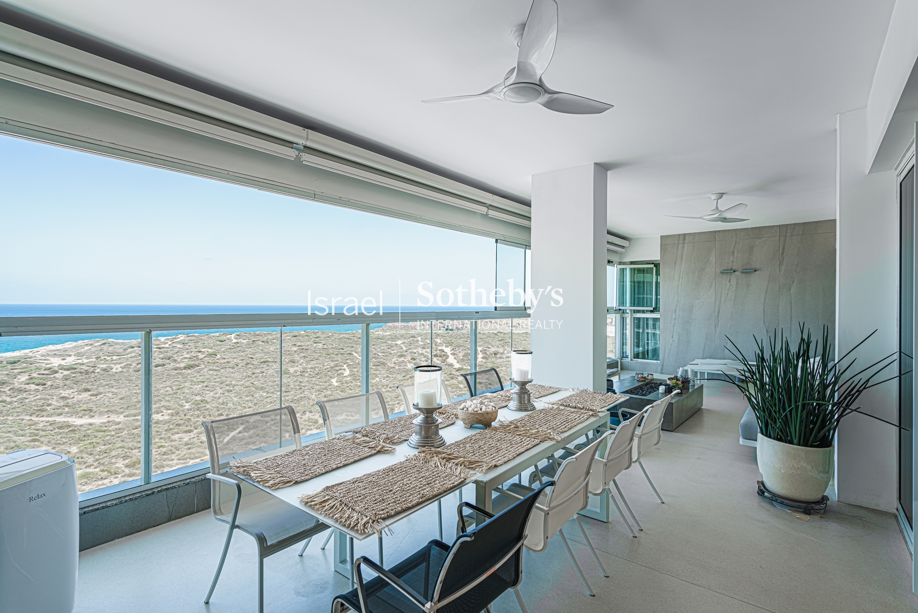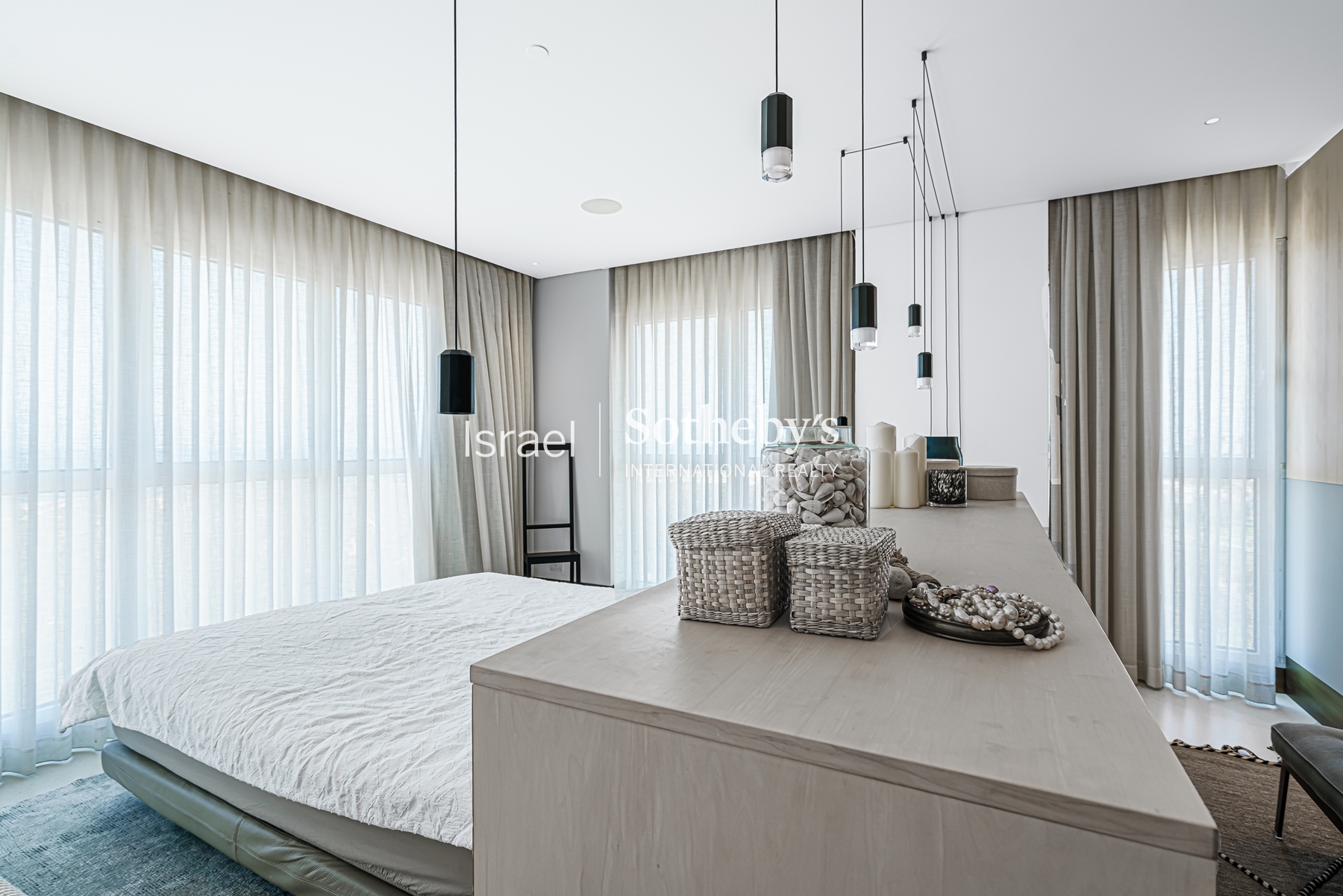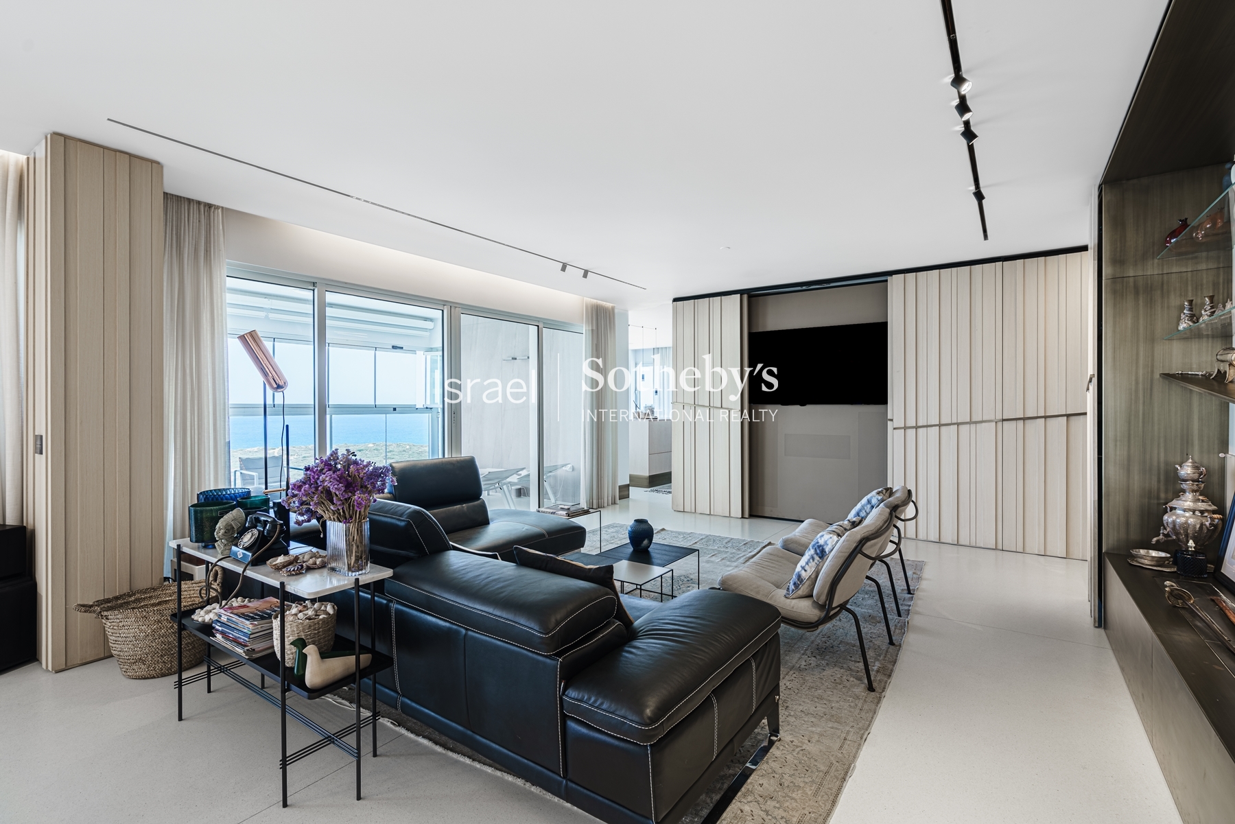 This apartment spreads over 295 m2 on one level with additional 48 m2 of covered terraces featuring an outdoor kitchen, fireplace, sun beds and breathtaking sunsets over the Mediterranean Sea. The meticulously designed by Tal Goldsmith Fish plan includes an open space living room with a fireplace, three guest and one vast in-suite master bedroom, two family corners and an office. The designer kitchen by Habitat is fully equipped with Miele electric appliances. In addition, it features an island along with a built-in wine fridge.