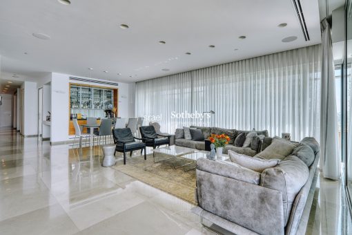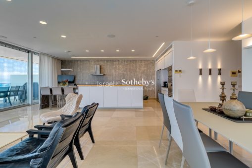 Meticulously designed with a contemporary open floor layout, the expansive living room opens to breathtaking views of the Mediterranean Sea. A state-of-the-art designer kitchen complements the space, making it ideal for both everyday living and sophisticated entertaining.