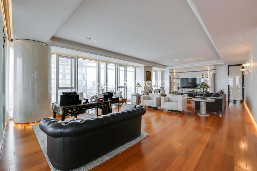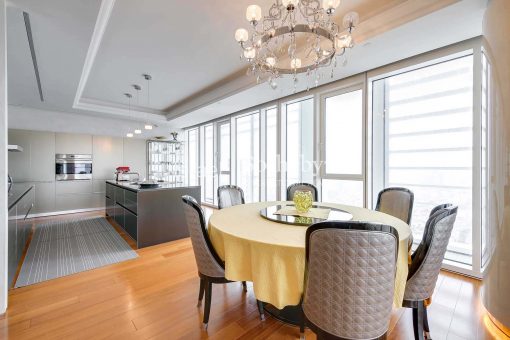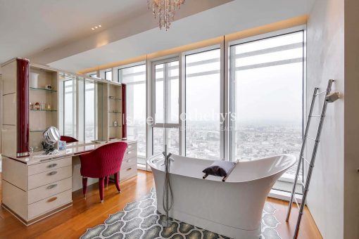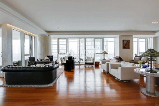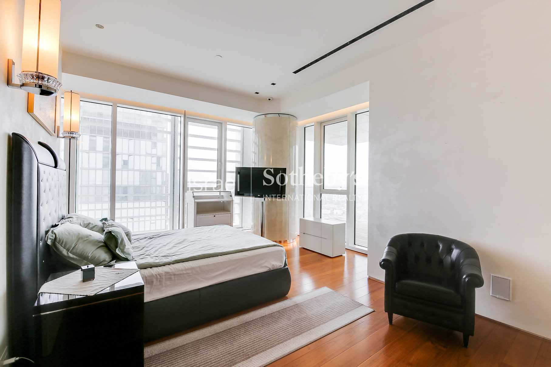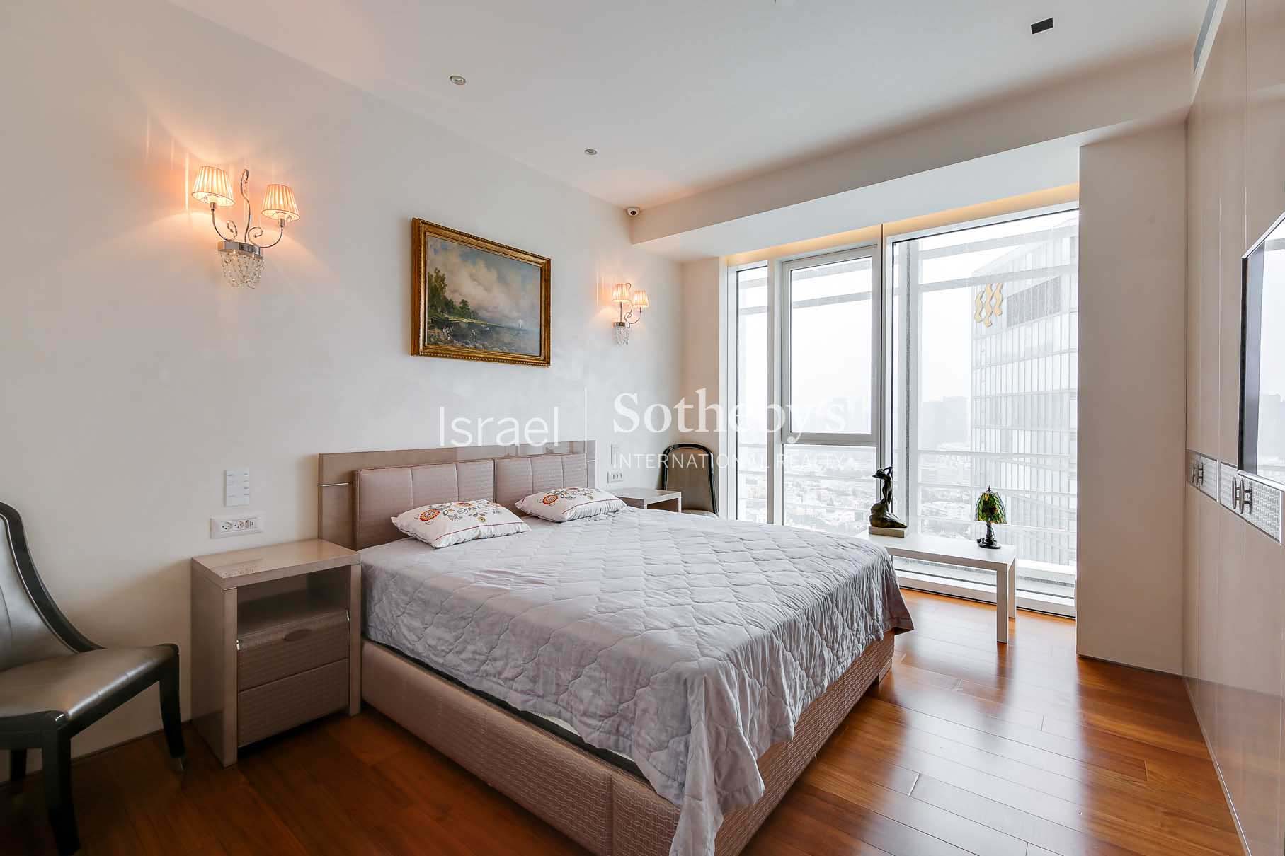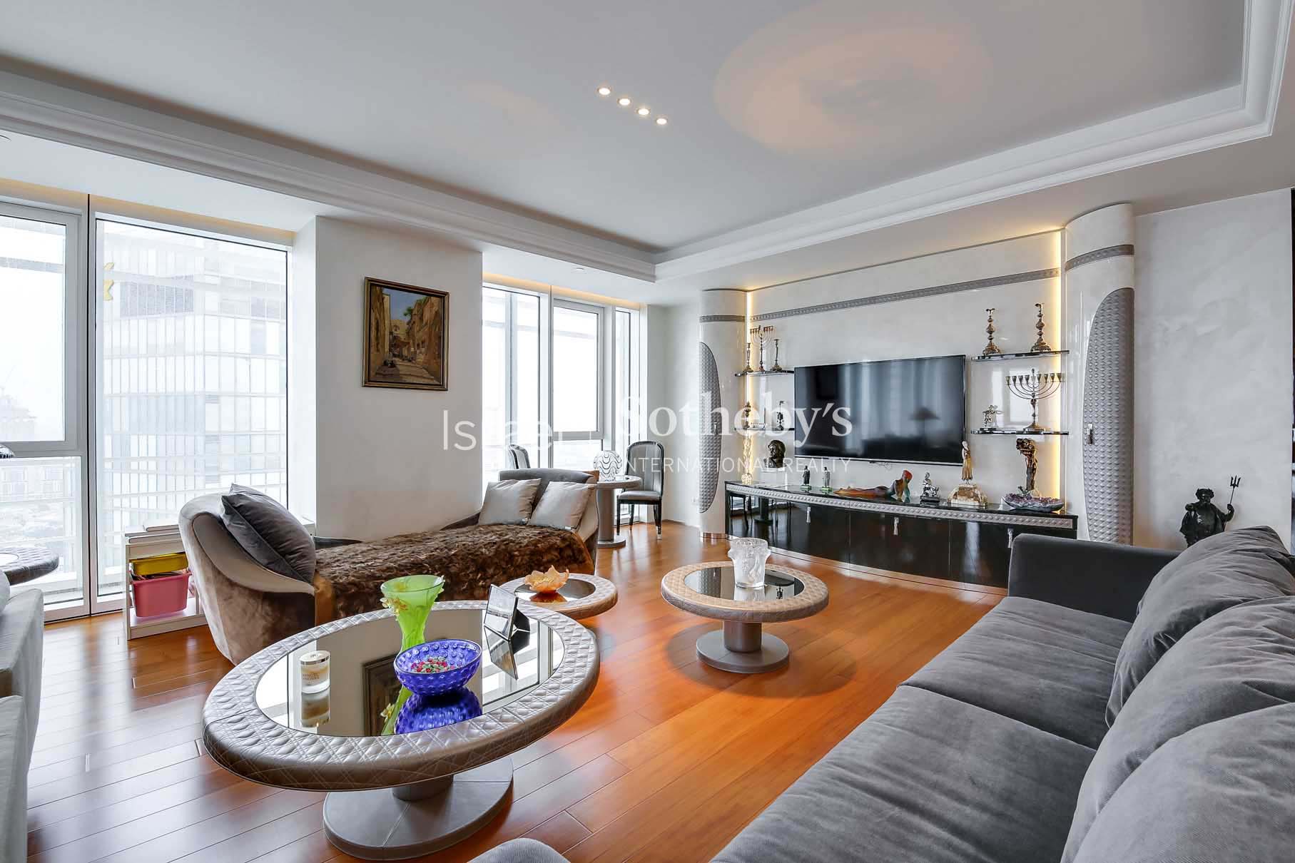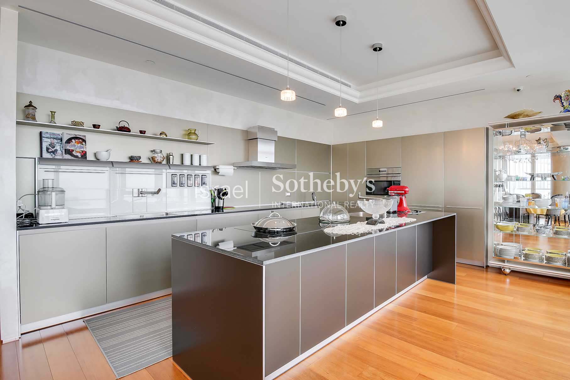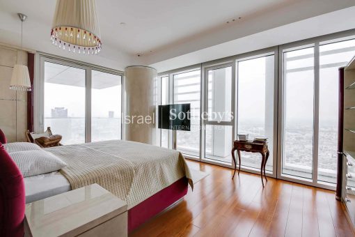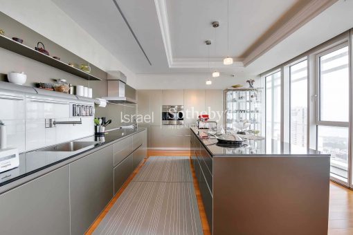 Ascending high above the city on the 31st floor at Meier on Rothschild Tower, a perfect luxury apartment is situated, featuring impressive floor to ceiling glass windows that allow natural sunlight to fill the room and provide magnificent panoramic views of the Mediterranean Sea and Tel Aviv’s city line. The apartment offers spectacular living space extends over 315m2 with 3 meters high ceilings and additional two 12m2 terraces, and contains luxurious amenities and finishes such as Bulthaup kitchen, Teak parquet flooring, Minotti rugs, Lalique chandeliers, custom designed furniture by Giorgetti and 3 spacious perfectly designed en-suite bedrooms.