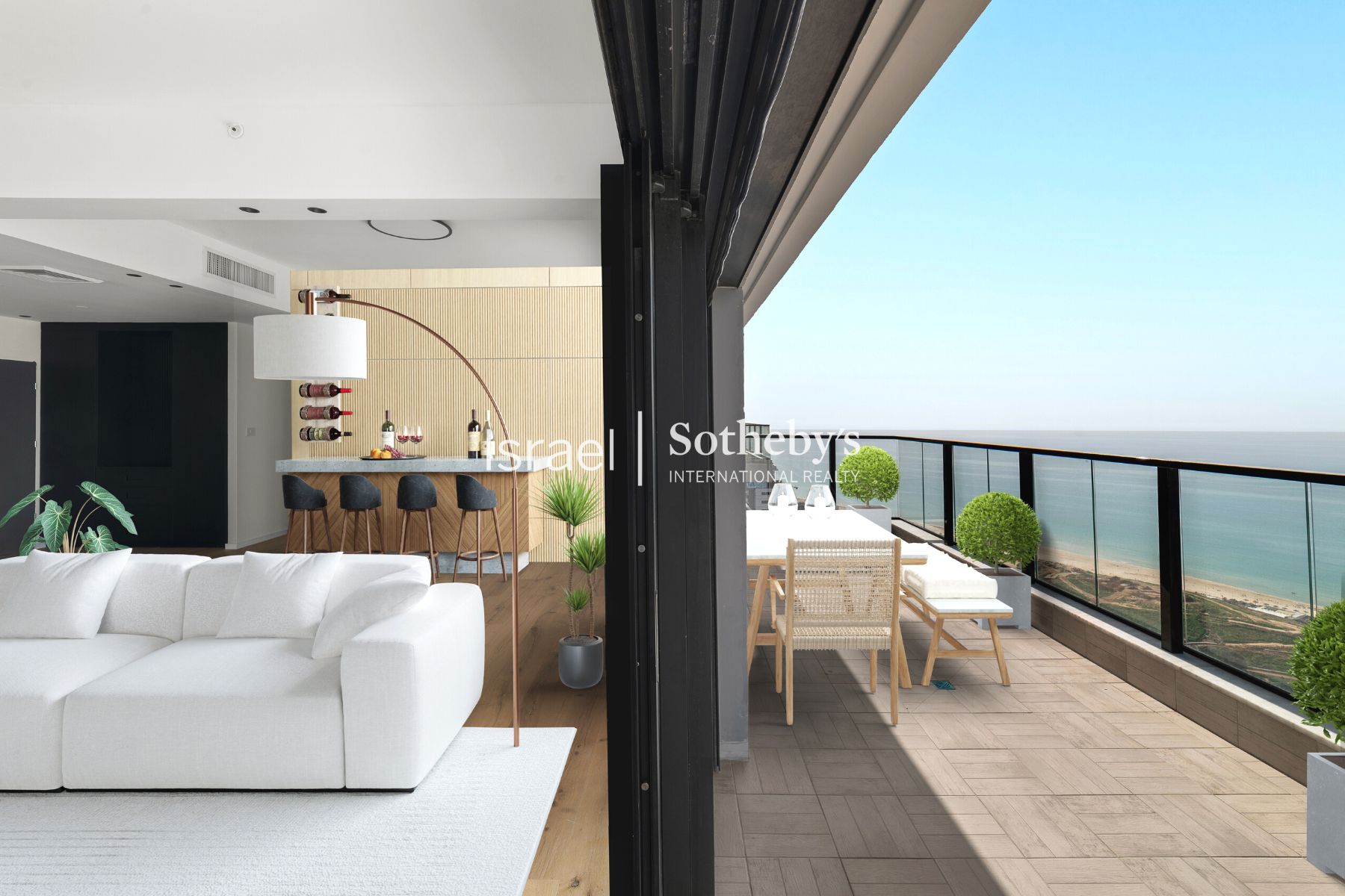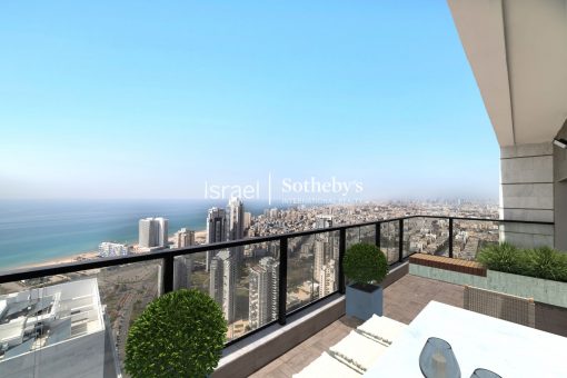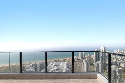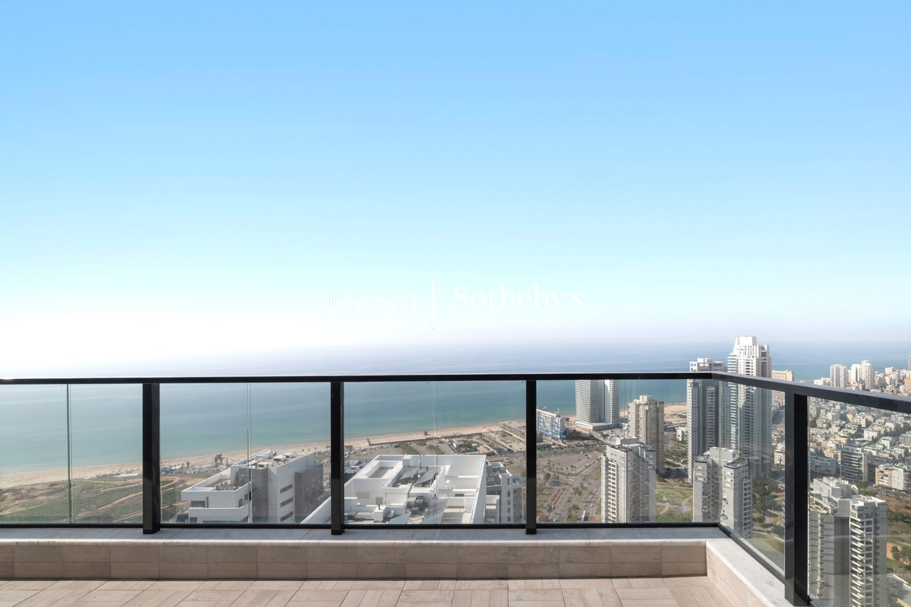 This exquisite mini-penthouse in the prestigious Park Hayam neighborhood of Bat Yam is a remarkable property offering unparalleled luxury and breathtaking views of the Mediterranean Sea. Located on the 44th floor of a 45-story tower, it spans 125 square meters, with an additional 21 square meter sea-view terrace. Designed by renowned Israeli architect Israel Kfir, the property boasts a modern and thoughtful layout, featuring a spacious living room, an open-plan fully equipped kitchen, a primary bedroom, two additional bedrooms, a separate service room with a new washing machine and dryer, and three bathrooms.