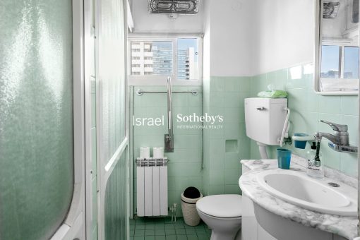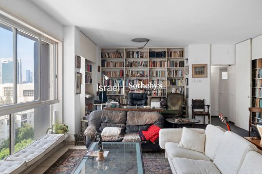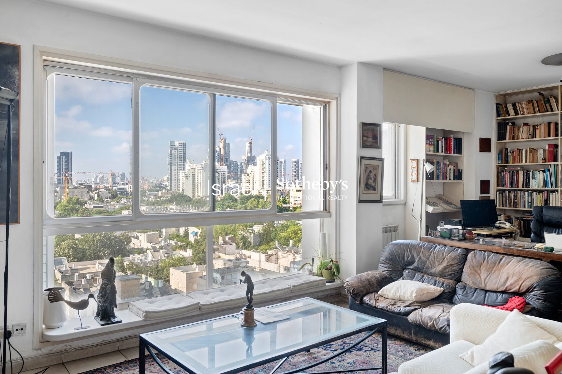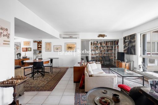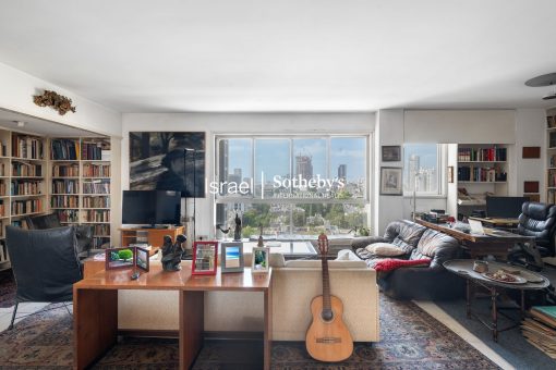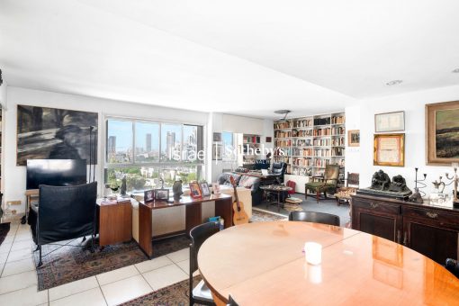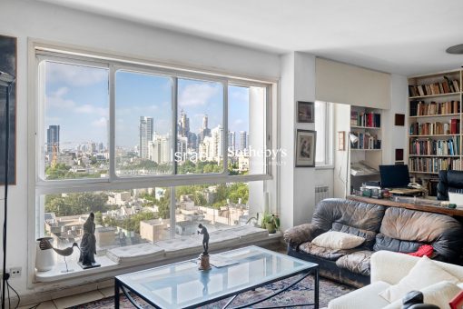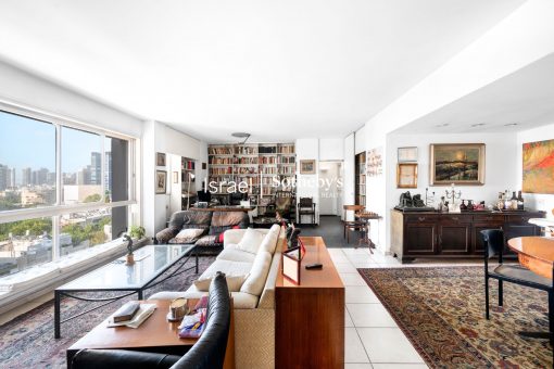 This spacious 5-room apartment, spanning approximately 140 square meters, is situated on the 5th floor of a 15-story building in the heart of Tel Aviv, on Shaul Hamelech St. above London Minister center and Tzavta Theater.