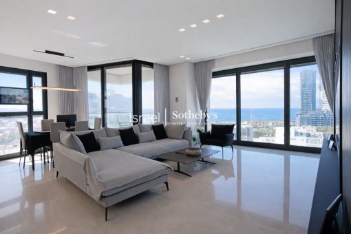 The residence offers approximately 125 sq.m. of interior living space, complemented by a 14 sq.m. balcony with sea views. The apartment features a spacious living room, two bedrooms, an indoor secure room (Mamad) currently used as a walk-in closet, an upgraded kitchen, and one private parking space in the tower’s underground parking lot.